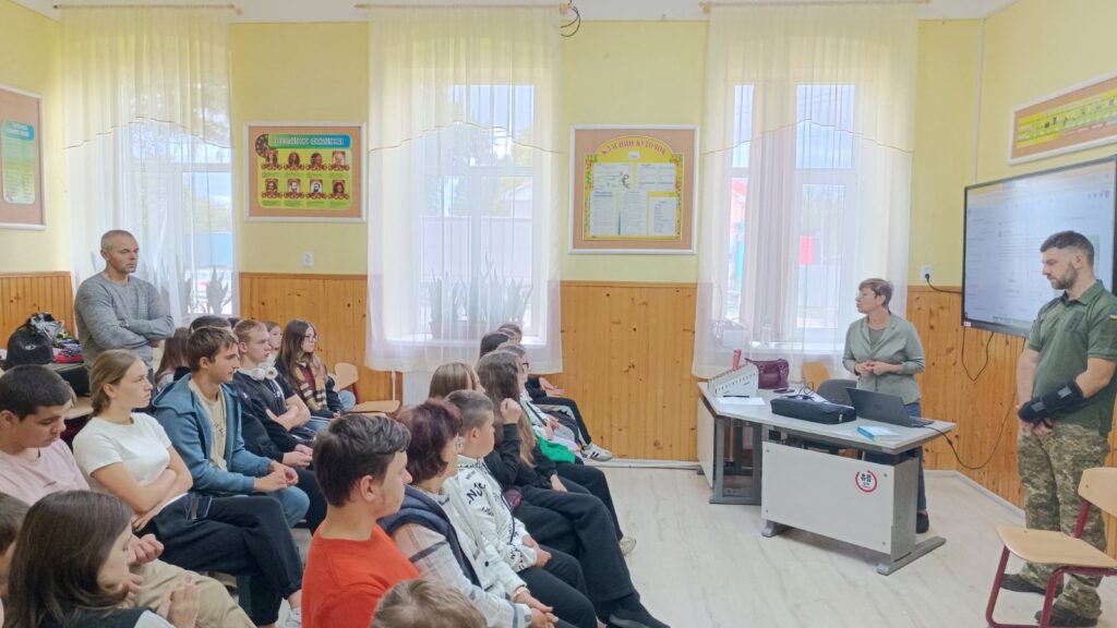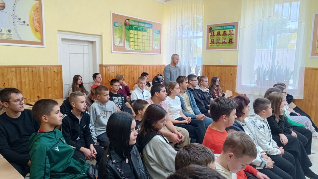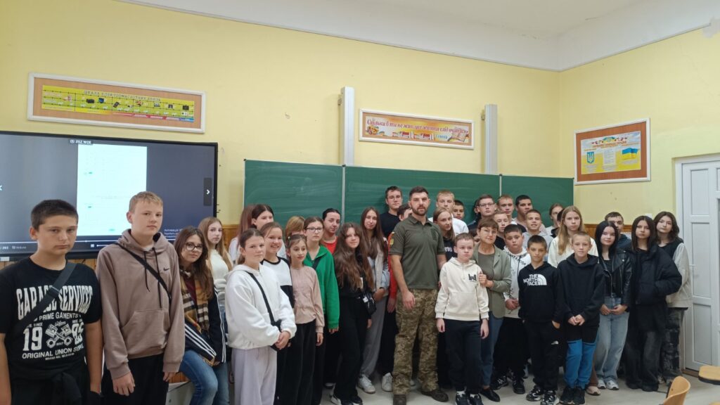 Павло зараз перебуває на лікуванні в госпіталі після складного поранення. Я запросила його в цей знаменний день, щоб він розповів дітям, як змінилися умови в зоні бойових дій за останній час. І хоч нашому гостю було важко говорити через поранення, він цікаво та змістовно розповідав про необхідність вчитися, опановувати технічні спеціальності, вміти надавати першу допомогу собі та іншим.