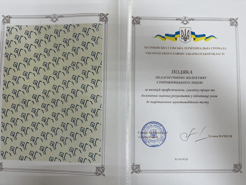 Цьогорічне визнання їхньої праці прийшло у вигляді високих результатів національного мультипредметного тесту, які показали наші учні. Саме за ці досягнення колектив ліцею, напередодні Дня працівника освіти, був відзначений Подякою Холмківської сільської територіальної громади Ужгородського району Закарпатської області.