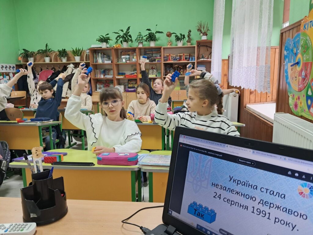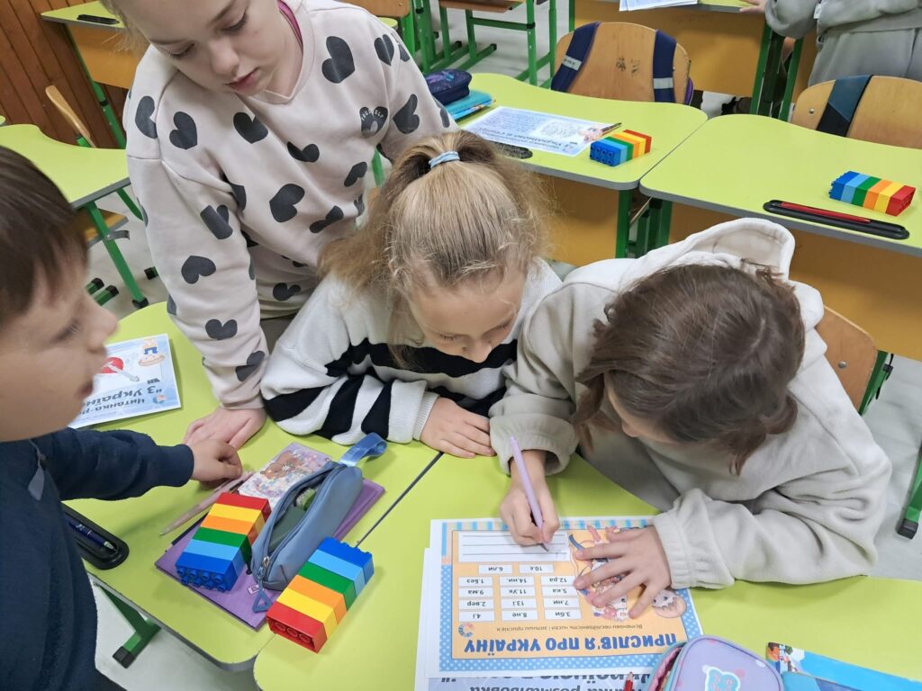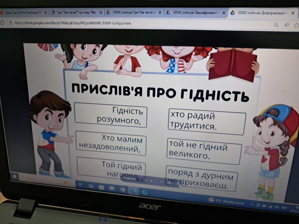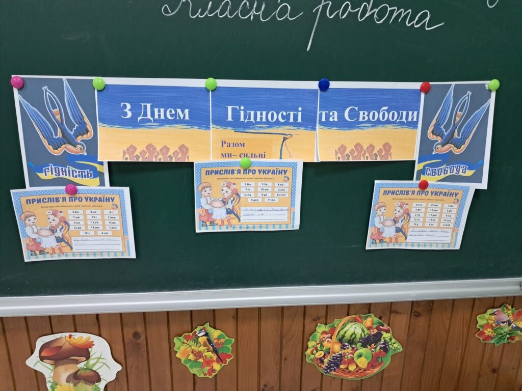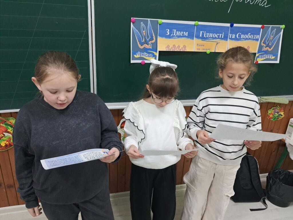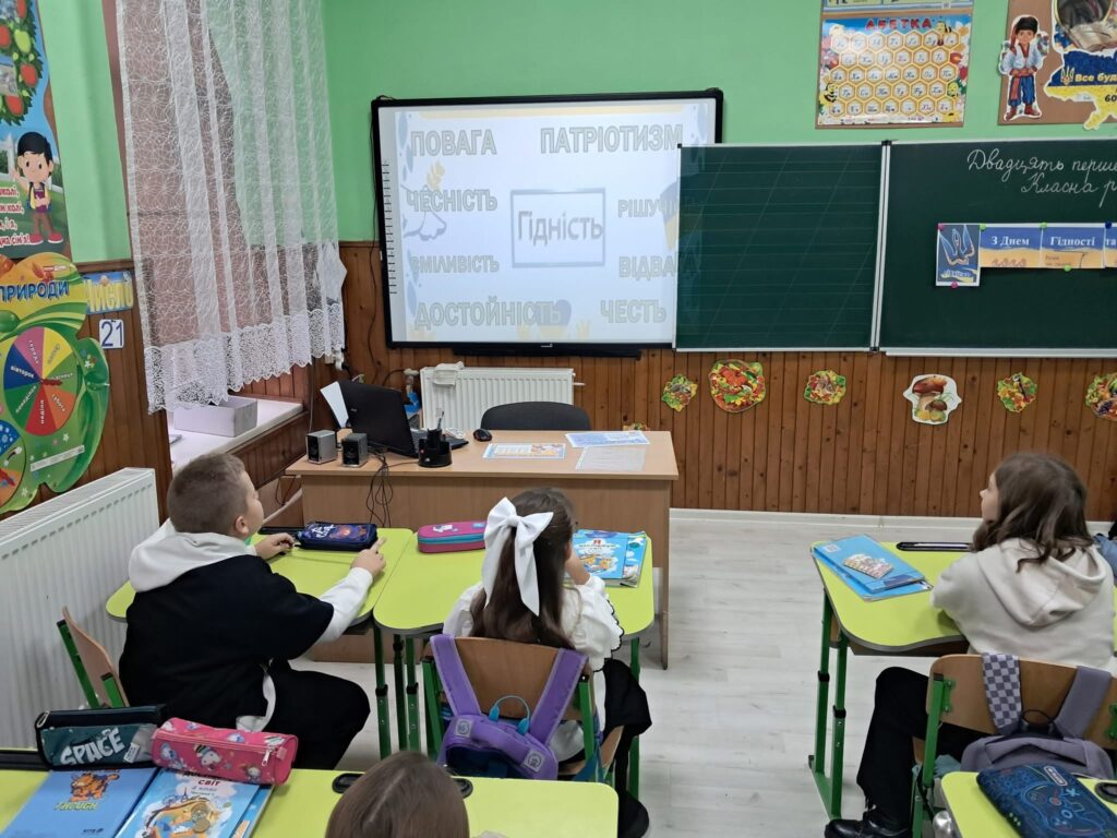 Діти переглянули пізнавальне відео про події, які стали символом мужності та незламності українського народу. Під час заняття школярі працювали з прислів’ями про гідність, свободу та повагу, обговорювали їхній зміст і значення в житті кожної людини.